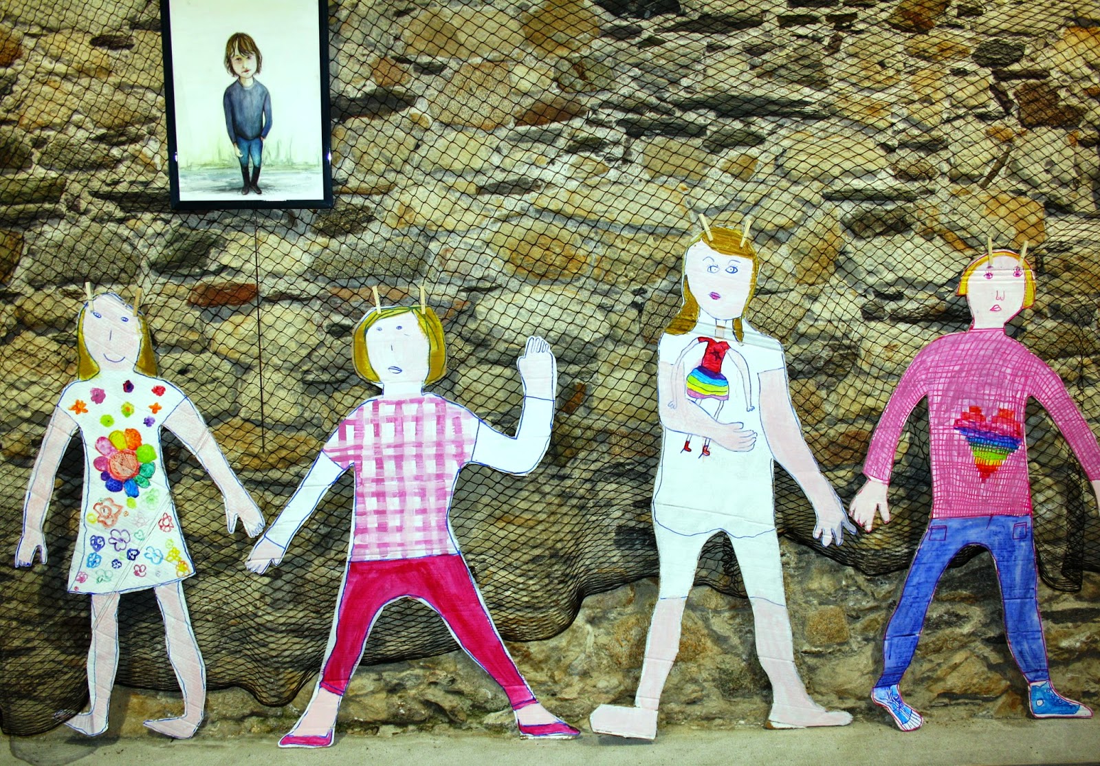 Dans les filets de Sardine, les silhouettes grandeur nature de ses jeunes élèves qui ont ainsi appris à travailler deux par deux pour relever les contours de leur corps puis se sont bien amusés à s’habiller de couleurs.